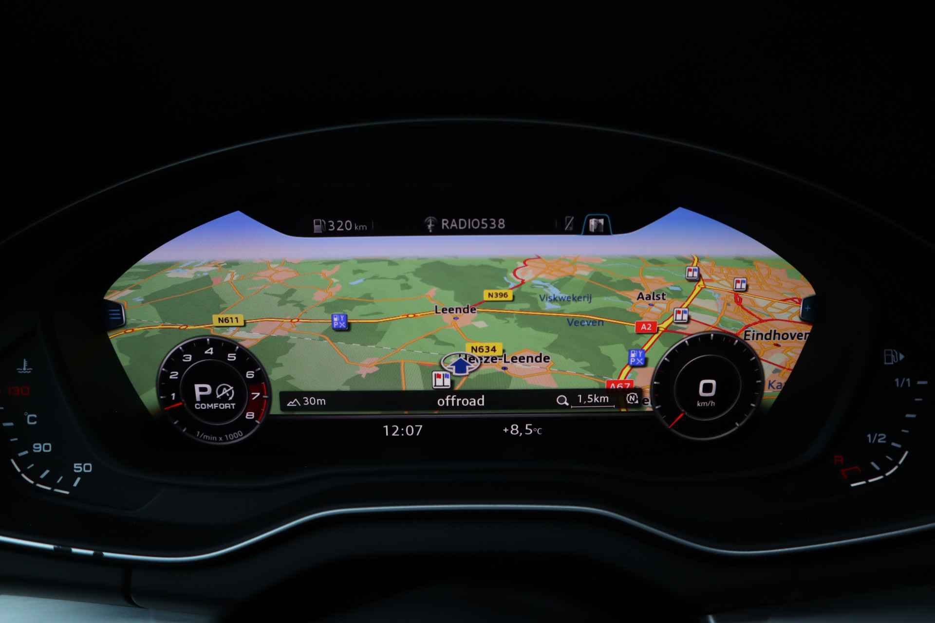 Snelheid, brandstofinfo, noem maar op. Het digitale dashboard houdt u permanent op de hoogte. Goed en overzichtelijk. Overzichtelijk en veilig parkeren met de achteruitrijcamera. Overal en altijd. Adaptive cruise control is veilig en comfortabel. De snelheidsregelaar houdt automatisch afstand tot het voertuig dat voor u rijdt. De ingebouwde file assistent is een echte helper als het vaststaat onderweg. Het systeem meet ruimte tot de auto vóór u permanent en activeert zelfs de remmen als uw voorligger stopt. Pech of storing, altijd vervelend. Maar met Connected Services weet u direct wat eraan scheelt. En dus ook wat er moet gebeuren. Met premium audiosysteem, navigatiesysteem met harde schijf, WIFI-hotspot, achteropkomend verkeer waarschuwing, automatische airconditioning en schakelpaddles aan het stuur is deze Audi helemaal compleet.