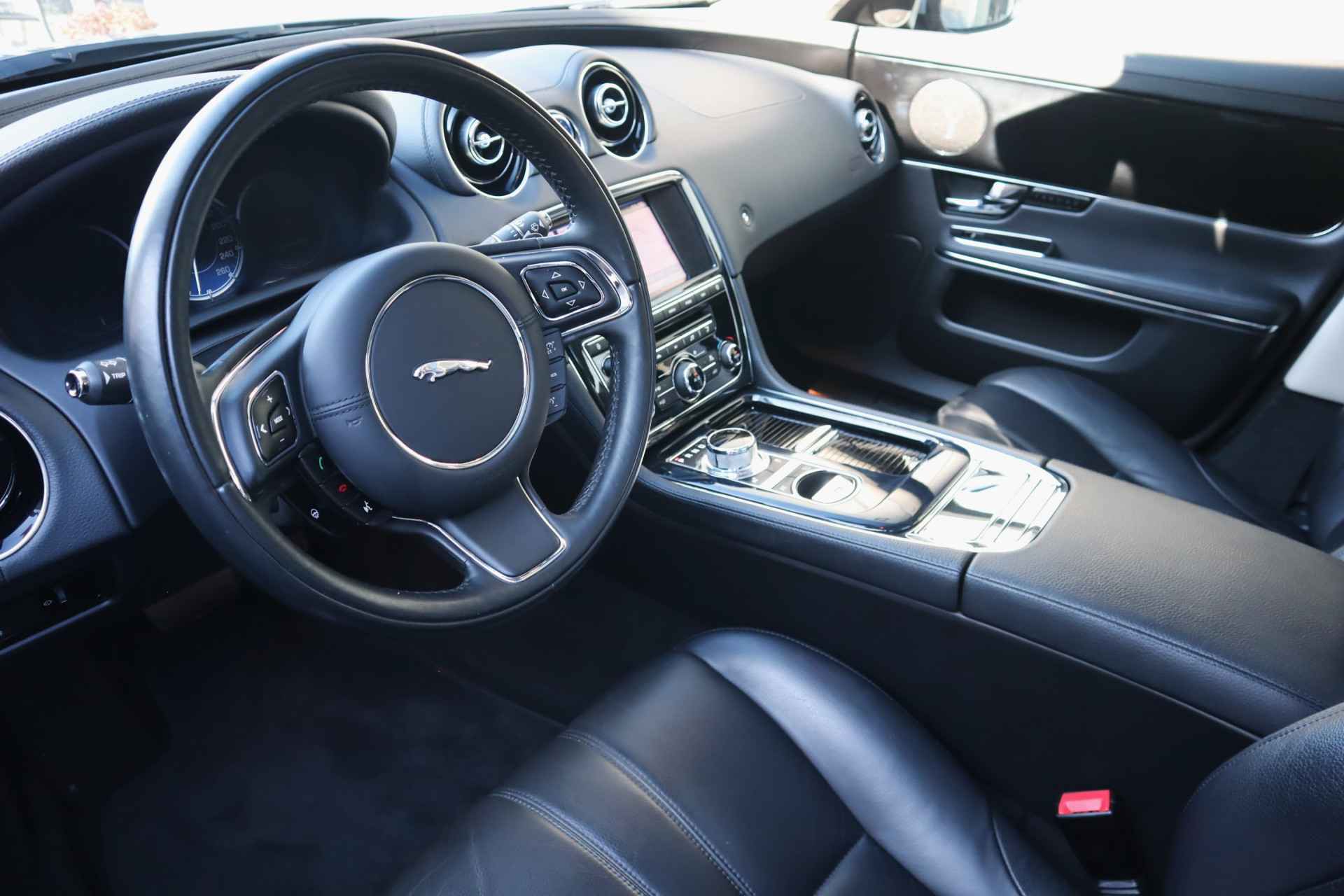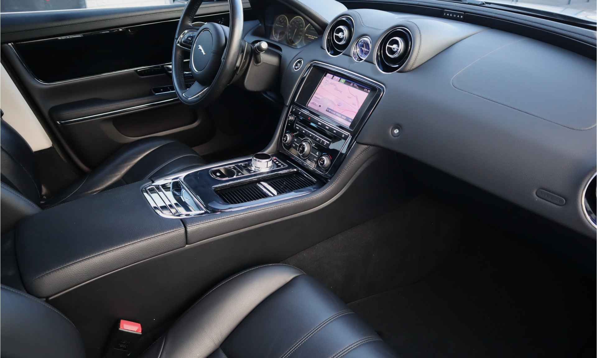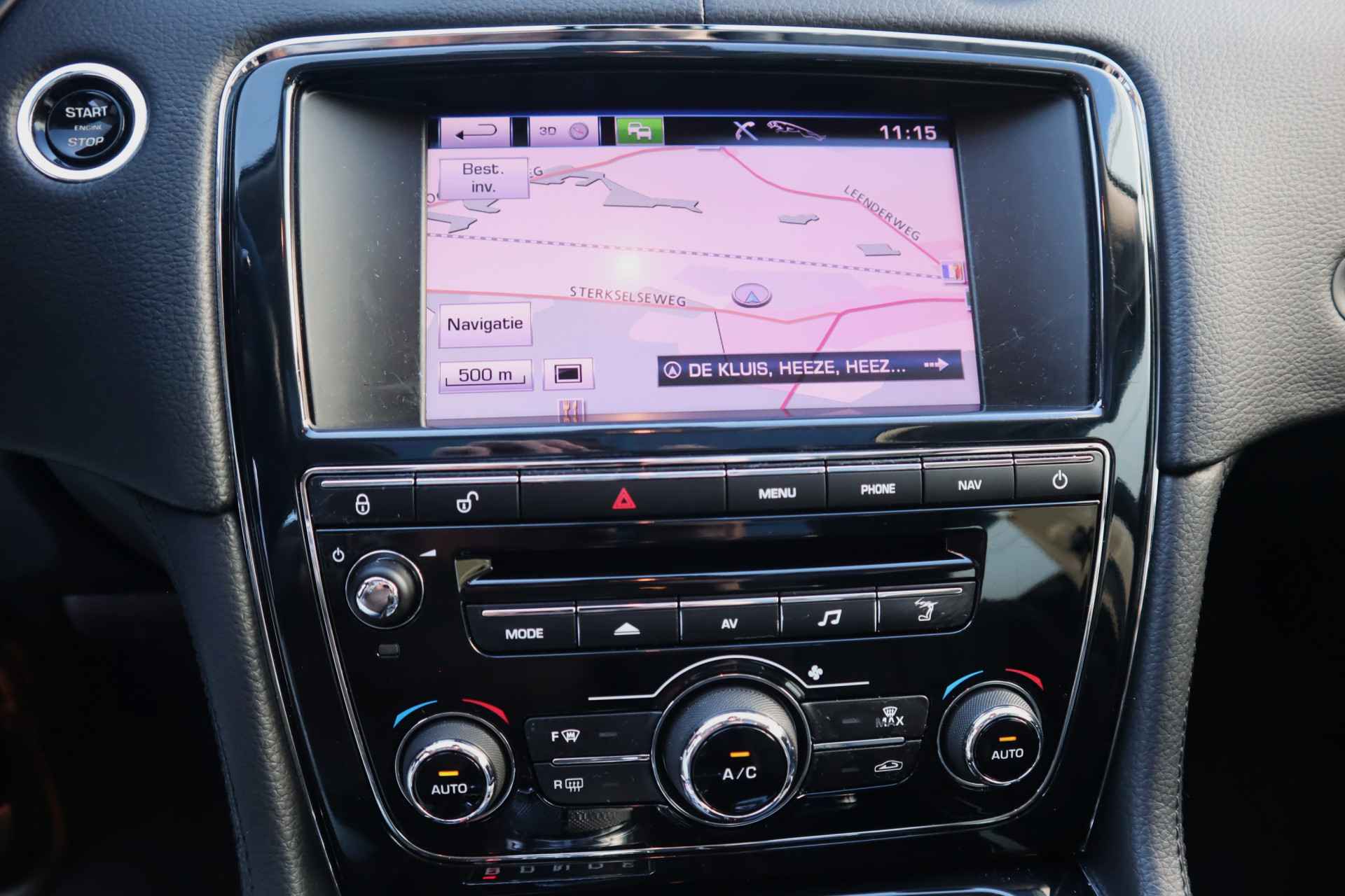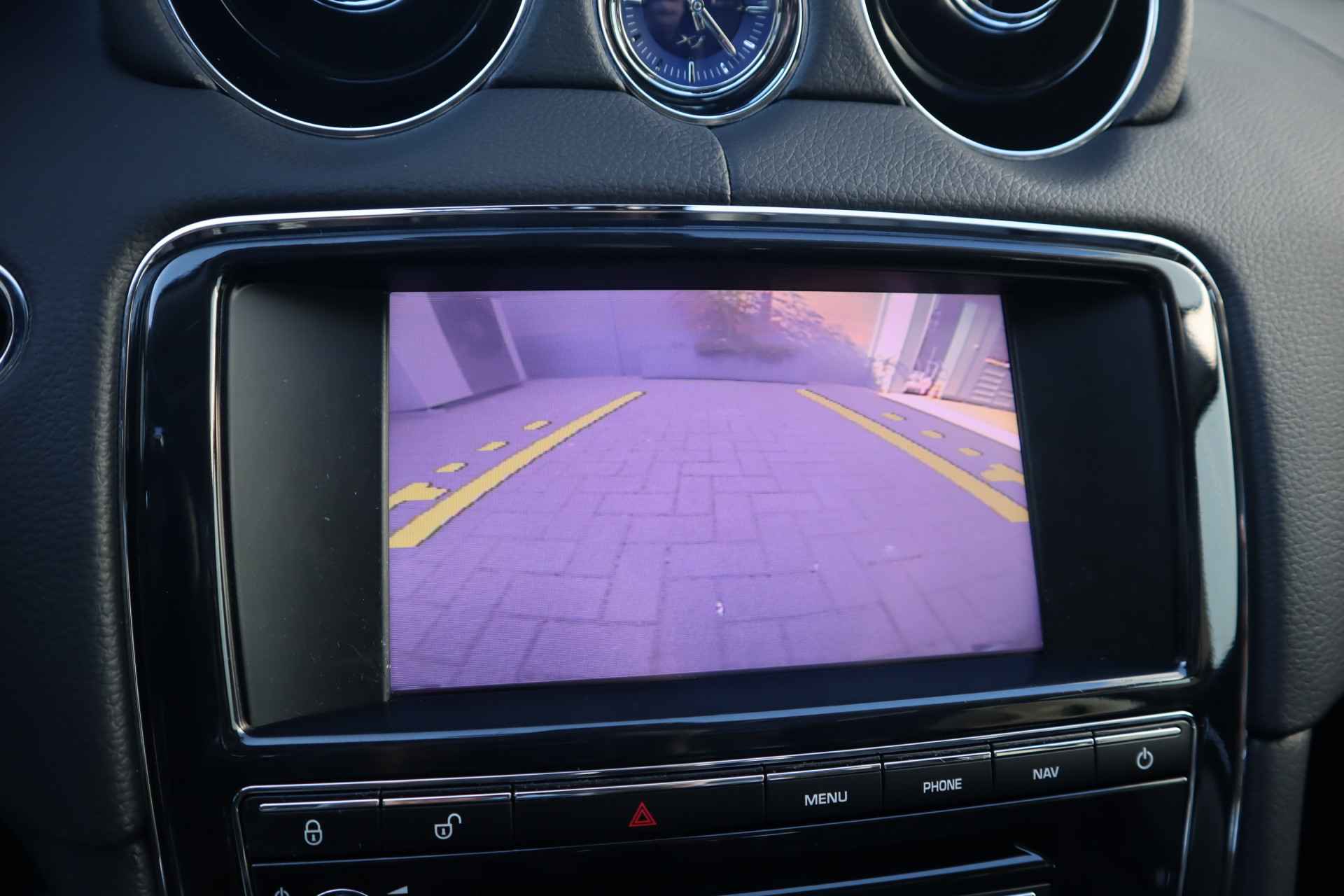 Altijd achter zicht, nooit meer nekkramp! De achteruitrijcamera maakt het supermakkelijk. Natuurlijk is er ook electronic climate control aanwezig. De regensensor reageert op de neerslag die op de voorruit belandt. Van een paar spatjes tot een hoosbui: de ruitenwissers weten wat ze te doen staat. Lekker koersen op een constante snelheid: daarvoor zorgt de cruise control. Een mooie eigentijdse optie is de keyless entry: zonder sleutels gaan alle sloten open zodra u in de buurt bent! Deze Jaguar is voorzien van navigatiesysteem met harde schijf, automatisch dimmende binnenspiegel en centrale deurvergrendeling met afstandsbediening.
